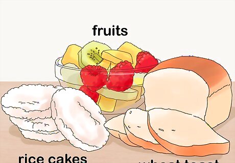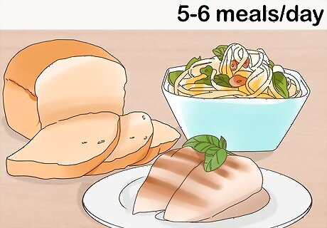 Eat 5-6 small meals throughout the day. Stuffing yourself with carbs during three large meals can lead to stomach upset and a general feeling of heaviness. Instead, break down your carb calories into a series of meals or snacks spaced out every 2 hours or so throughout the day. Remember that it’s not necessary to eat more overall, you just need to consume more carb calories. For example, three slices of wholegrain toast spread with honey makes for a great carb meal. If you are looking for something even more substantial, try a grilled chicken breast with a bowl of wheat pasta.
