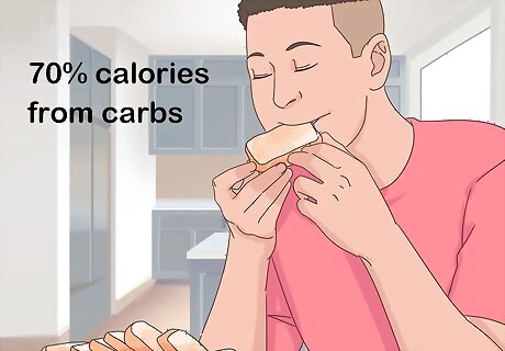 Keep your diet at 70% of calories from carbs. Don’t load up on carbs at the last minute. If you try to eat a ton of carbs the night before or hours before your event, you may suffer from nausea or extreme stomach upset. In fact, this can be so extreme that you might vomit or cramp during your event.