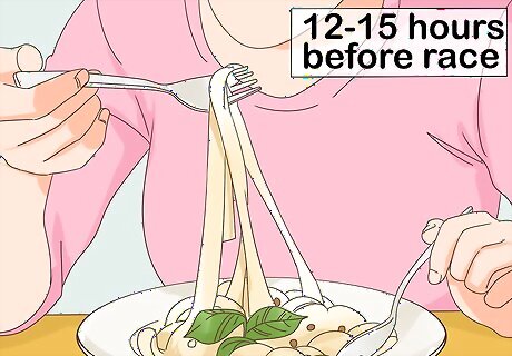 Eat your last substantial meal 12-15 hours before your race. If your event is in the morning, this means that you’ll want to eat a carb-heavy dinner the night before. This will give your body time to turn those carbs into energy. Many athletes have a particular favorite meal that they prefer, such as a plate of wheat pasta with marinara sauce.