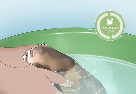 Bathe your ferret once every 6 months or annually. You can also wait to bathe your ferret until it is dirty due to a spill or illness. Bathing your ferret too often can dry out its skin and prompt over-activated stink glands, which can cause even more ferret smell. Use ferret shampoo, which can be found at a pet store. Your ferret's coat is important to its health. If its coat is soft, full and doesn't have an unusually smelly odor, then your ferret is healthy.