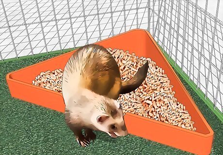 Train your ferret to use the litter box. Watch to see where your ferret goes to the restroom when in the cage. Place the litter box in this same location. Then, put a few fresh droppings into the box, so that it smells like a restroom for your ferret. Most ferrets will quickly start using the box. If your ferret refuses to use the box, then experiment with changing out the litter to another type of plant fiber.