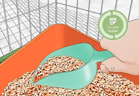 Clean your ferret’s cage at least twice each week. Use a scooper to remove any soiled litter from the box. Pull out the cage carpet and wash it on a warm setting. Take out any hammocks or bedding and wash them as well. Wipe down any toys and the cage bars with a natural cleaner. You can make a safe, natural cleaning solution by adding some lemon juice or vinegar to water.