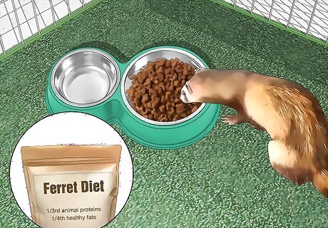 Give your ferret a diet with both animal proteins and fats. An ideal ferret diet will contain about 1/3rd or more animal proteins and about 1/4th healthy fats. Look for a quality dry ferret food that contains ingredients at these levels. You can also talk with your vet about using high-quality kitten food as well. Ferrets enjoy small, cut-up snacks of cooked turkey, cooked egg, or chicken meat. Avoid giving your ferret fresh fruits or vegetables. The sugars in fruits can irritate your ferret’s digestive system. And, ferrets have been known to choke on raw vegetables. Keep in mind that ferrets need to eat about 8 to 10 times per day because they process food so quickly.