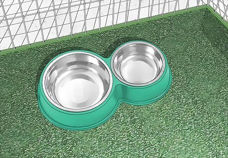 Obtain suitable feeding containers. You will need 2 bowls (preferably stainless steel or ceramic) : 1 for food and 1 for water. Each dish should hold at least 8 ounces of food or water. Pet stores sell dishes that can be attached to the side of the cage to minimize spills. It’s also a good idea to install a water bottle that hangs from an interior wall of the cage. Wash the bowls and bottle with warm water and dish soap or run them through the dishwasher on a weekly basis. This will help to keep algae from developing.