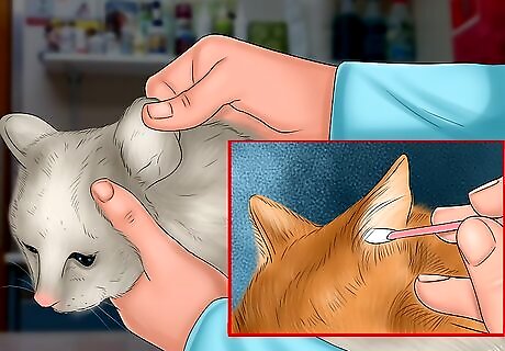 Check their ears. You should also get in the habit of checking your cat's ears on a weekly basis. You may squeeze in an ear check at the end of their brushing session, when they are relaxed and calm. Look for any signs of redness inside their ears or on their ear flap. You should also check for a bad smell coming out of their ears, as these could be a sign of an infection. If the cat's ears appear dirty, use a cotton ball dampened with water or an animal ear cleanser to clean them. If you suspect your cat may have an ear infection, bring them to the vet right away.