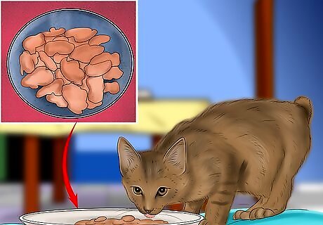 Give the cat high quality food. Feed your Pixiebob a diet of high quality dry and canned food. Pixiebob cats are not known to be fussy about what they eat and will respond well to a mix of dry and canned cat food. You may also feed your cat freshly cooked meat as long as it does not contain bones. Make sure you stick to the same high quality brand food for your cat, as this will ensure they get used to the food and can digest it easily. You may ask your vet for recommendations on food brands for your Pixiebob cat.