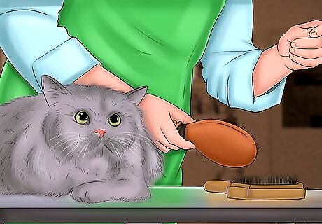 Schedule monthly visits to a professional groomer. If you feel overwhelmed about doing all the grooming for your cat yourself, you may bring your cat to a professional groomer. Look for a groomer who has worked with Pixiebob cats in the past and ask around for recommendations from friends or family who own cats. A professional groomer can help to ensure your cat looks clean and healthy on a regular basis. If you find professional grooming expensive, you may only bring the cat to the groomers several times a year or before a big event, such as a cat show or a stay with friends while you are out of town.