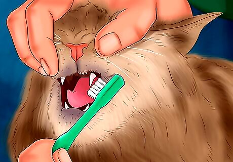 Brush their teeth. As part of your grooming routine, you should brush your cat's teeth with toothpaste that is approved by your vet and meant for animal use. Brushing your cat's teeth on a consistent basis can ensure their dental health is good and that they have fresh breath. Try to brush your cat's teeth at least two to three time a week. You should try to get your cat used to regular teeth brushing early so they become used to it and consider it part of their grooming routine.
