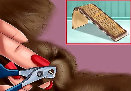 Trim their nails. You should also trim the cat's nails so they do not get too long. Nails that are too long can end up carrying bacteria and increase the cat's risk of an infection. You can use a special nail trimmer for cats or a small nail trimmer. To get the cat to stay still during the nail trim, you may try putting a clean towel over its head, leaving its paws exposed. Hold the cat in your lap with the towel over its head and trim its nails so they do not get too long. You can also invest in nail caps for your cat to protect their nails and prevent them from getting too long. Getting your cat a scratching pad that they can scratch and play with can also help to keep their nails short and under control.