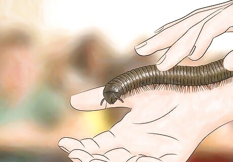 Handle them carefully. You can touch your millipedes, just make sure to be gentle. Pick them up using two hands and hold them lightly. Remember, millipedes can be very long, so you want to support their entire body. Millipedes do not sting or bite. They will not harm you. If you have children, you can teach them to gently hold the millipedes. This will be a great learning experience. Millipedes often curl into a tight ball when scared. If this happens, place them gently back in their home.