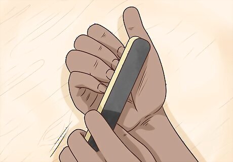 File and buffer your nails after you cut them to smooth them out. Use a nail file to file down the pointed edges on the sides of your nails and round them out. Then, use a buffer to smooth out the jagged tips of your nails and make them look neat. Make sure you use a buffer with a lightly abrasive surface to avoid irritating the skin around your nails. You can pick up this type of buffer at any store that sells skin care supplies.