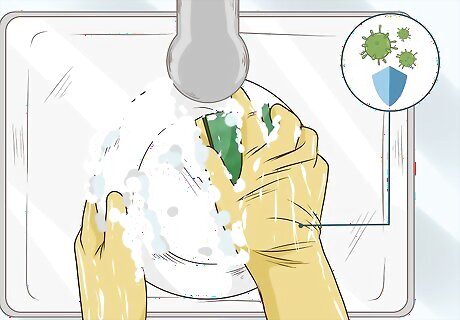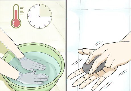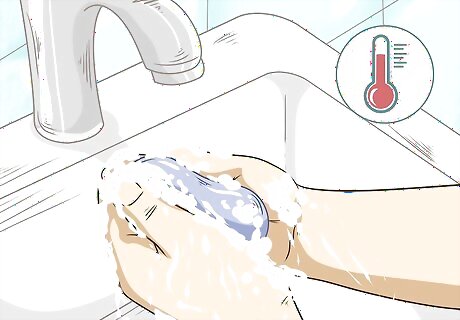 Wash your hands with gentle soap and lukewarm water. Avoid using hot water to wash your hands, since hot water can strip away natural oils and leave your hands dry and itchy. Use mild, gentle soap to avoid irritating your skin whenever you wash your hands. You should always wash your hands when your hands are visibly dirty and whenever you handle garbage, prepare food, or use the restroom. However, to avoid irritating your skin, don’t wash your hands excessively (i.e., when you don’t have to).