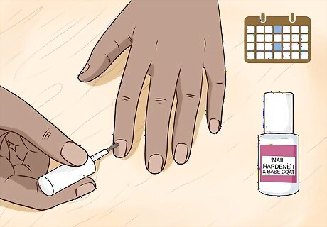 Apply nail hardener to your nails if necessary to keep them strong. Nail hardeners or nail strengtheners contain vitamins that reinforce the skin on your nails to make them more resilient. Apply a nail hardener once a day for 2 weeks to treat brittle or easily broken nails. You can pick up nail hardener at most beauty salons or pharmacies. Many hardeners also dry to a clear, matte finish, in case you want to avoid the appearance of having nail polish on your fingernails. Note that you can also use nail hydrators to keep your nails from becoming weak and brittle.