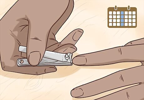 Cut your nails about once every 1-2 weeks to keep them clean and tidy. Use your clippers to cut your nails straight across, removing the off-white crescents at the tip. Cutting your nails on a regular basis will keep them from becoming long, jagged, and dangerous. For best results, invest in a portable clip and file kit from a dermatologist’s office. This type of kit will likely include additional tools you can use on your nails, such as trimming scissors or a buffer. Nails grow pretty slowly, at a rate of about ⁄10 inch (2.5 mm) each month, so you shouldn’t need to cut them any more frequently than once a week.Tip: Cut your nails after you get out of the shower, as they’ll be softer and easier to cut through.