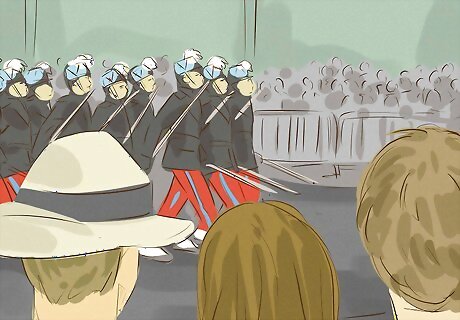 Watch the military parade down the Champs Elysées in the morning. Since 1880, nearly every Bastille Day has been celebrated with a traditional military parade from the Arc de Triomphe to Place de la Concorde. There are also marching bands, floats, and an aerial show with acrobatic planes and helicopters for spectators to enjoy. The parade starts at 10 am and the route gets crowded, so stake out a spot early on to make sure you have a good view. The French President leads the march and the prime minister is always in attendance, often accompanied by other foreign dignitaries.