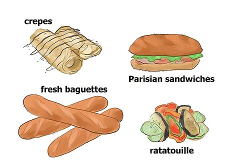 Make ratatouille, crêpes, and Parisian sandwiches with fresh baguettes. The most important aspect of any Bastille Day celebration is the food. Prepare simple, satisfying sandwiches with fresh French bread, ham, creamy butter, and seasonal veggies, and serve it with a side of cole ratatouille, or vegetable stew. Top off your guests' plates with savory crêpes. You can make ratatouille with vegetables like eggplant, tomatoes, zucchini, and red pepper. Go online or check out a French cookbook for a simple recipe. To make your own crêpes, mix batter from an egg, milk, butter, flour, and parsley and cook it in a flat, thin crêpe pan. Then, make a filling with savory foods like ham, smoked salmon, spinach, mushrooms, tomatoes, and Gruyere cheese.