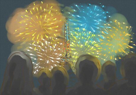 Enjoy a spectacular fireworks show at night. Paris' famous Bastille Day fireworks take place at the Champ de Mars, the gardens between the Eiffel Tower and the Ecole Militaire. If you plan to watch from a seat on the crowded Champ de Mars, claim your spot early. You can also get great views from higher ground, like a tower or rooftop, or many of the bridges over the Seine. The fireworks often start around 11 pm, but for the best seats on the Champ de Mars, try to arrive in the afternoon. Have a picnic dinner with friends while you wait for the show. There is typically a concert before the fireworks, usually starting around 9 pm.