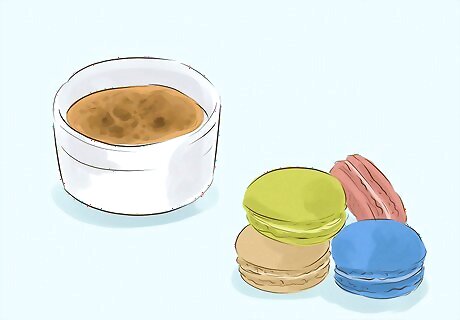 Satisfy your sweet tooth with delicious French pastries. For the perfect dessert to finish off your French picnic, go with sweet pastries like éclairs and macarons—you can make your own or buy them from a local bakery. You can also bake or buy sweet crêpes or even crème brûlée for even more tasty, sugary options. For a more low-key dessert option, serve a simple cake or batch of cupcakes frosted to look like a French flag.