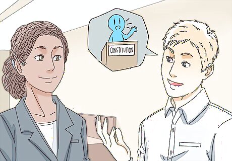 Invite a local scholar to speak about the Constitution. Reach out to a constitutional scholar at a nearby university, museum, or courthouse. Ask them to give a lecture at your school, library, or office about a relevant topic, such as their current research in constitutional law or a contemporary constitutional debate. In many states, county and appellate judges usually visit schools and libraries to give speeches and answer questions about constitutional law. Contact your local federal court if you’re interested in hosting a judge at your institution.