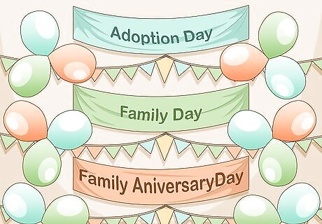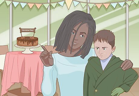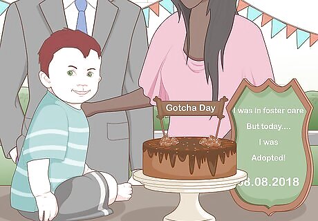 Celebrate National Adoption Day. If you feel that a celebration of Gotcha Day will cause your adopted child emotional distress or is insensitive in general, focus your celebration instead on National Adoption Day. This informal holiday is typically celebrated on the Saturday before Thanksgiving. A celebration of National Adoption Day can focus on the good work being done by adoption agencies in general, rather than celebrating your particular case of having adopted a child. Your celebration could include a fun party for all of the adopted children in your neighborhood or community. This will allow the adopted children to form friendships and uncover shared experiences and realize that they are not alone in their adoption experiences. A celebration of National Adoption Day can also help reduce any lingering stigma around the concept of adoption.