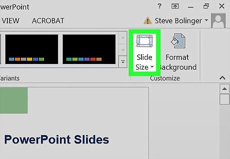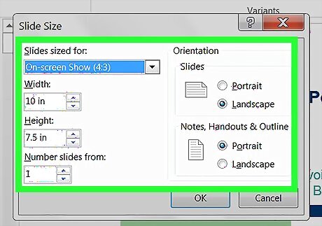 Adjust the slide size as needed. There are many options from which to choose, including some useful presets. To choose a preset for a specific purpose (e.g. on-screen show), click the “Slides sized for” drop-down at the top-left corner of the window, then make your selection. To set the size manually, use the arrows next to the “Width” and “Height” blanks to increase or decrease the size (in inches). You can also enter your own values, including decimals. On the right side of the window, select either Portrait or Landscape orientation to further fine-tune the slide size.
