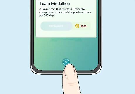 Scroll down and tap TEAM MEDALION. You can find this item in the "TEAM CHANGE" section of the shop. It will open the selected item's details. You won't see this item unless you've already reached level 5, and picked a team.