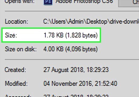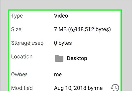 Review the folder's size. In the View details window, you should see a "Size" heading; your selected folder's size in Google Drive will be displayed next to this heading. For example, you might see "30 MB" if your folder is 30 megabytes in size, or "2.4 GB" if it's 2.4 gigabytes in size.