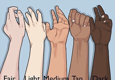Find out if you have a fair, light, medium, or deep skin color. Fair skin color is often described as porcelain skin that burns in the sun. Light skin color is still fairly pale, but you may be able to tan more easily and not burn as quickly. Medium skin tones are often described as olive skin or tan. Dark skin color is deep and rich and is most often seen in people of color.Tip: Skin color is not a set rule, and you can become more or less tan over time.