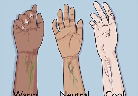 Determine your undertones by looking at your veins. These will help to determine what colors look good on you. Go into a room that has natural light and look at the veins in your wrist. If your veins are more green, you have a warm skin tone. If they are more blue or purple, you have a cool skin tone. If you can’t tell the difference or they are a mixture of both green and blue, you have a neutral skin tone. If you have an olive complexion, you probably have a neutral skin tone.