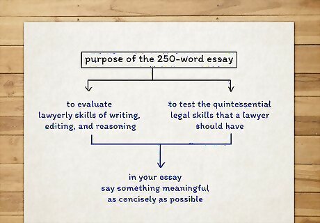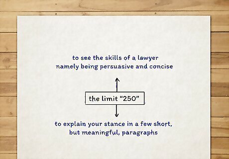 Know the purpose of the 250-word essay. The YLS admissions committee uses The 250 to evaluate the very important lawyerly skills of writing, editing, and reasoning. Look at this essay as your first exercise as a lawyer. Your task for this essay is to use the very limited word limit you are provided to say something meaningful. The essay is designed to test your ability to say something meaningful as concisely as possible and to prepare you for the real world in which judges (when you are in practice) and law professors (when you are in law school) take word limits very seriously. The purpose of the 250, then, is to test the quintessential legal skills that a lawyer should have, namely being persuasive and concise at the same time.