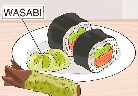 Add wasabi. Wasabi is often served on the side with sushi. You can dip your sushi in wasabi to add flavor and a little spiciness. If you enjoy the taste of wasabi, add it freely to your sushi as it is packed with antioxidants. You only need to dab a small amount of wasabi on your sushi for added flavor and health benefits.