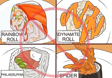 Avoid fancier rolls. Specialty rolls include things like rainbow rolls, dynamite rolls, Philadelphia rolls, and spider rolls. These rolls are packed with extra ingredients, such as cream cheese, and tend to be larger. This makes them much higher in calories than regular rolls. If you really want to try a specialty roll, offer to split one friends. They can be good for a group setting, as everyone can try a small amount without going overboard.