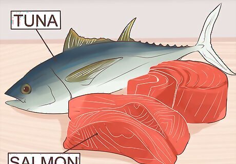Go for salmon and tuna. When choosing healthy proteins, salmon and tuna are your best options. They are rich in omega 3 fatty acids, which are great for heart health, as well as high in protein and vitamin D. When choosing rolls, look for rolls that contain salmon and tuna. However, just because a roll has salmon or tuna does not necessarily mean it's healthy. Watch out for high calorie ingredients, like cream cheese, for optimal health.