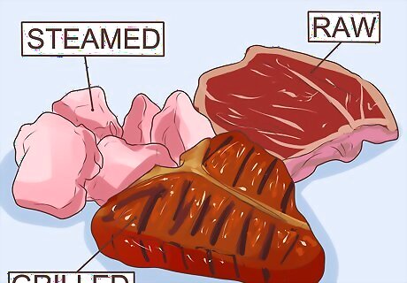 Look for meats that are steamed, grilled, or raw. How meat is prepared can affect its health. When choosing meats, look for steamed, grilled, and raw options. These meats have not been tampered with as much, which means they will have less added calories from things like sauces, sugars, and oils.