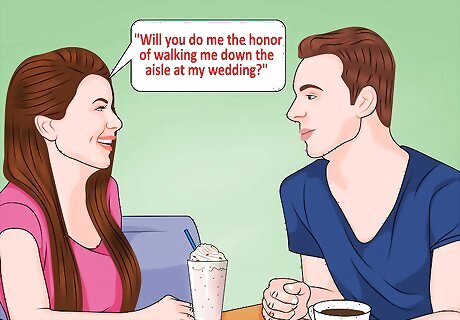 Pose the question to the person. Let the person know you want to ask them an important question and that you hope they say yes. You might explain to them that they have been an important person in your life. You may then phrase the question by asking, "Will you do me the honor of walking me down the aisle at my wedding?" Or you may ask, "Would you be willing to be a part of my wedding and walk me down the aisle?"
