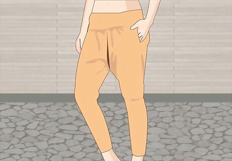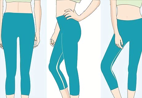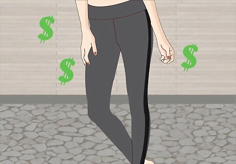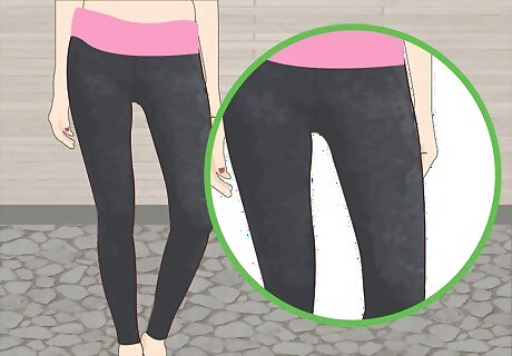 Buy fitted leggings for yoga. You don't necessarily need a compression-style legging if you're going to be wearing them mainly for yoga, and you may find compression leggings a hindrance. You do, however, need to choose a fitted style that won't interfere with your poses. Remember that in yoga, you may very well be bending over with your butt in the air, so before buying leggings, make sure you can bend over completely without exposing more than you want, and make sure the back of the leggings aren't sheer when stretched over your backside. Wearing fitted leggings also will allow your yoga instructor to check your form, which they may be unable to do if you're wearing looser clothing that conceals the position of your body. Additionally, many yoga poses require you to balance one foot on the other leg, or grip parts of your leg. This can be difficult if you're wearing loose clothing. While your yoga leggings should be fitted, they shouldn't be tight or constricting. Pick breathable fabric and an elastic waist that allows you to breathe deeply and doesn't pinch.