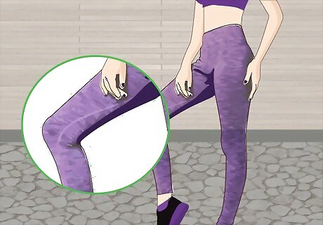 Move around in the fitting room. Part of fit is understanding how the leggings are going to move with you and what's going to happen when you stretch and bend. Make movements similar to those you'll make in your exercises to get a general idea of fit and comfort. Doing deep bends and leg lifts can help you determine how the fabric will move with you. If you're flexible enough, doing a split will give you a good indication of whether the leggings will be constricting on your upper legs and hips. As you move, take note of whether you feel the need to pull your leggings up or adjust them. Keep in mind that if you're spending all your time adjusting your clothing, you're probably not going to get a very good workout. If the leggings feel tight or uncomfortable after doing a few moves in a fitting room, they probably will give you even more trouble when you're deep into a 20- or 30-minute routine.