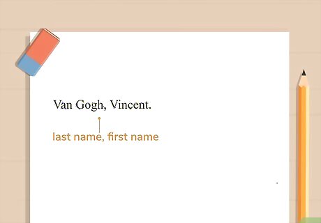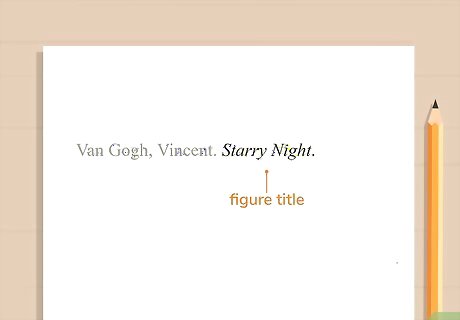 Start your Works Cited entry with the name of the author. When you're citing a figure, the "author" is the name of the original artist. Type the original artist's last name first, followed by a comma, then their first name. Place a period after the name. Use the original artist's name even if you are citing to the figure in a book written or edited by someone else. You'll include the name of the book author or editor in the publication information for the book.