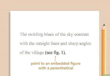 Point to an embedded figure with a parenthetical in your main text. If you embedded an image of the figure in your paper, use a parenthetical citation to point your reader to it when you discuss it in the main text. Embedded figures are labeled with the abbreviation "fig." And the corresponding number. Do not capitalize the abbreviation. For example, you might write: "The swirling blues of the sky contrast with the straight lines and sharp angles of the village (see fig. 1)."