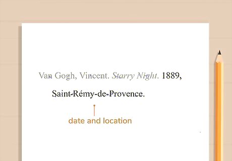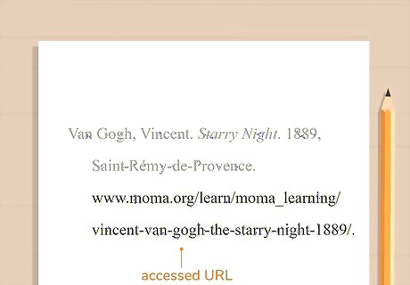 Include information on where you found the figure. You want to point your reader to the exact figure that you accessed, not the original. Therefore, if you saw a reprint of a painting in a book, you would provide a full citation to the book. If you found it online, you would include a URL. If you're including a URL, do not include the "http://" portion. Place a period at the end. Example: Van Gogh, Vincent. Starry Night. 1889, Saint Rémy-de-Provence. www.moma.org/learn/moma_learning/vincent-van-gogh-the-starry-night-1889/.Tip: The date you accessed a page online is optional. However, your supervisor or instructor might require you to include it.
