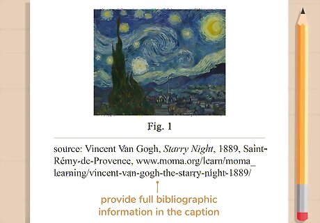 Provide full bibliographic information in the caption. If you've embedded the image in your paper, you can provide the information you would normally include in a Works Cited entry in your caption. If you do this, you won't have to include a Works Cited entry for the work. When including bibliographic information in the caption, include all the elements you would include in a full Works Cited entry. However, separate each element with a comma instead of a period and write the artist's first name first. For example: Vincent Van Gogh, Starry Night, 1889, Saint Rémy-de-Provence, www.moma.org/learn/moma_learning/vincent-van-gogh-the-starry-night-1889/. If you included bibliographic information in the caption, use a parenthetical that points your reader to the figure if you discuss the work elsewhere in the main text of your paper. For example, you might write: "The tone of the painting is dreamlike and ethereal (see fig. 1)."
