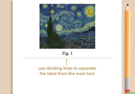 Use dividing lines as necessary to separate the label from the main text. Because MLA requires you to use the same formatting and size for the caption and the main text, your readers may have difficulty determining which words make up the caption and which words make up the main text if the figure appears in the middle of a page. A solid dividing line between the caption and the main text can remedy this problem. For another option, you can try to arrange the figure and the main text so that the figure and its caption appear at the bottom of the page and a new paragraph starts on the next page. If you have more than one figure in your paper, use the same fix for all of them so that your paper is consistent. For example, if you use a dividing line for one figure between the caption and the main text, you should include the same line for all.Tip: Embed your figure as close as possible to the part of your main text that discusses the figure.