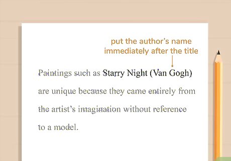 Put the author's name immediately after the title in the main text. Normally, MLA style would call for you to put your parenthetical citation at the end of any sentence discussing the source. However, for figures, the rule is somewhat different if you include the official title of the figure in the main text of your paper. For example, you might write: "Paintings such as Starry Night (Van Gogh) are unique because they came entirely from the artist's imagination without reference to a model." On the other hand, if you include the author's name in your main text, there's no need for any parenthetical. For example, you might write: "The swirling dark blues in Starry Night are interpreted to be symbolic of Van Gogh's struggles with depression."