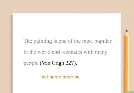 Provide the last name of the author in a parenthetical citation. Include a parenthetical citation at the end of any sentence in which you discuss the figure. The parenthetical citation usually just includes the last name of the original creator of the figure. For example, you might write: "The painting is one of the most popular in the world and resonates with many people (Van Gogh)."Tip: If you found the figure in a book, you would also include the page number on which the figure appears in your parenthetical citation. In MLA style, there is no punctuation between the name and the page number, like so: (Van Gogh 227).