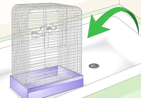 Put the cage in the shower or the sink. Make sure there is enough room in the shower for you to move around the cage and clean it. You can also put it in a deep sink to clean it. If you have a large cage, you can clean it in the yard next to a hose. Take out the liner in the cage and throw it away to prepare the cage for cleaning.