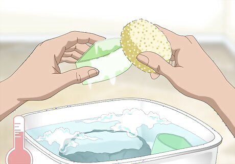 Wash food and water dishes with hot, soapy water. Take the food and water dishes out of the cage. Soak them in hot, soapy water for a few minutes. Then, scrub them with a brush or sponge and rinse them off with warm water. Make sure you get all the soap off of them. Let the food and water dishes air dry if you have a spare set of food and water dishes you can use for the cockatoo. You can also use a towel to dry off the dishes. Make sure the food dish is completely dry before you put bird food in it, as a wet dish can cause the food to mold.