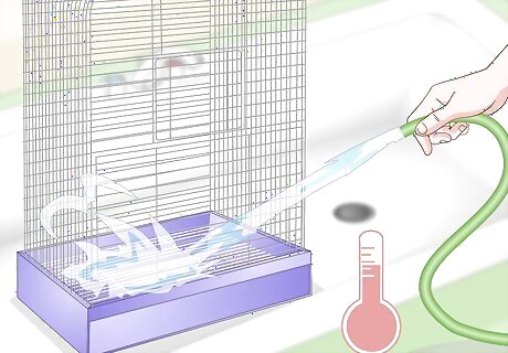 Spray down the cage with warm water. Have the shower, sink, or hose on the high setting. Use the water to blast off dirt, droppings, and dust on the cage. Rinse off the cage well with just water, moving it around under the water so it gets a good clean.