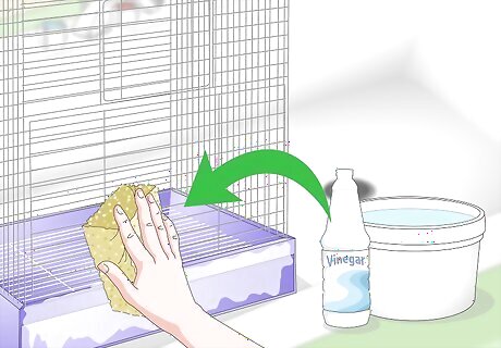 Clean the cage with vinegar cleaner. Combine 1 part white distilled vinegar with 2 parts water in a bucket. Dip a sponge or towel in the mixture and wipe down the cage. This will disinfect the cage and remove any odors. Wipe down the sides, top, and bottom of the cage. Scrub off dirt and droppings on the cage.