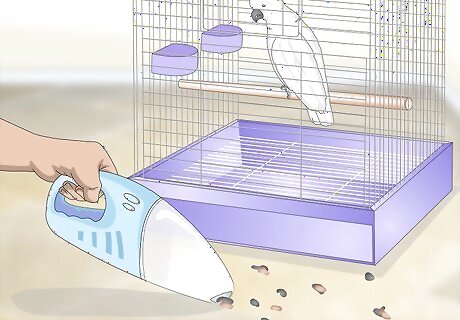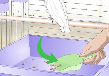 Remove droppings in the cage. Use a small shovel to scoop up droppings at the bottom of the cage. Do this once a day so the droppings do not stink up the cage. Removing the droppings will also prevent the cockatoo from catching diseases or infections. You can also scoop up any uneaten food at the bottom of the cage.