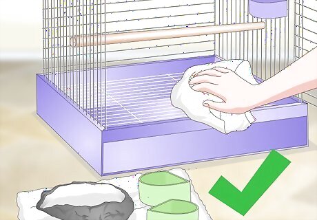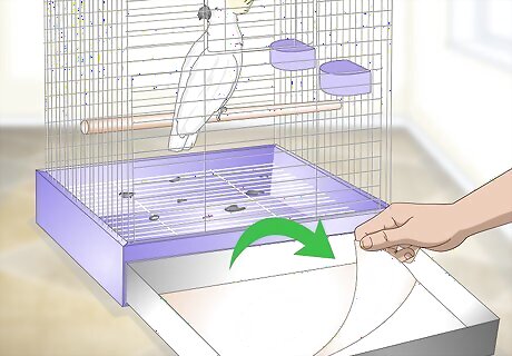 Put a fresh liner in the cage. Take out the old liner at the bottom of the cage and replace it with new liner. You may use newspaper or paper as liner for the cage. Put fresh liner in the cage at the beginning or the end of the day so it is clean. If you have layered the paper in the cage, you can remove the top sheet so the liner is clean and fresh. Only do this if water or droppings have not soaked through the top sheet.